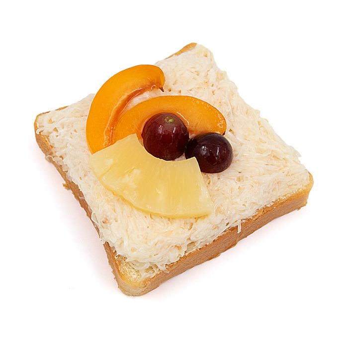 Zutaten: Toastbrot ((WEIZENMEHL, Wasser, Pflanzenfett (Rapsöl (teilweise gehärtet), Kokosöl), Backhefe, Milchpulver (MILCHSERUMPULVER, Dextrose, BUTTERFRAKTION), jodiertes Speisesalz, Frischhalte,- und Konservierungsmittel (Wasser, Rapsöl, Emulgatoren (E471, E481), Backmittel (WEIZENMEHL, Dextrose, Emulgator (E472e), GERSTENMALZMEHL, Stabilisatoren (Calciumphosphate), Citrus-Fruchtfasern, Enzyme, Mehlbehandlungsmittel (Ascorbinsäure)), Selleriesalat ((SELLERIE, Mayonnaise (Sonnenblumenöl, Tafelessig, EIGELB, SENF (Zucker, Gewürze), Speisesalz, Zucker, SAUERRAHM, Zitronensaft, Salz, Pfeffer)), Sandwich-Crème ((Pflanzenöl (Raps, Palm), Wasser, Emulgator (E471), Aroma, Speisesalz, Milchsäure, Beta-Carotin)), Ananas, Kiwi, Pflaumen, Trauben, Petersilie
