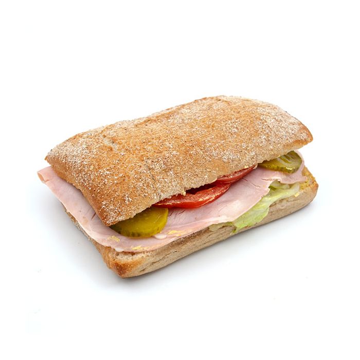 Zutaten: Ciabatta ((WEIZENMEHL, Wasser, ROGGENSCHROT, HARTWEIZENGRIESS, ROGGENMEHL geröstet, Milchpulver (MILCHSERUMPULVER, Dextrose, BUTTERFRAKTION), Backhefe, jodiertes Speisesalz, Backmittel (WEIZENMEHL, Dextrose, Emulgator (E472e), GERSTENMALZMEHL, Stabilisatoren (Calciumphosphate), Citrus-Fruchtfasern, Enzyme, Mehlbehandlungsmittel (Ascorbinsäure)), Hinterschinken CH((Schweinefleisch, Nitritpökelsalz (Kochsalz, Konservierungsstoff (E250), Traubenzucker, Stabilisator (E451), Aromen, Zucker, Antioxidationsmittel (E301)), Sandwich-Crème ((Wasser, SENF (Branntweinessig, Wasser, SENFKÖRNER, jodiertes Kochsalz, Zucker, Säuerungsmittel (E330, E334), Gewürze, Verdickungsmittel (Guarkernmehl), Gewürzextrakte, Antioxidans (E224 SULFIT), Pflanzenfett, Branntweinessig, Karottensaft aus Konzentrat, EIGELB, jodiertes Kochsalz, MILCHPROTEINE, modifizierte Maisstärke, Verdickungsmittel (Xanthan), Dextrose, Säuerungsmittel (E330)), Tomaten, Essiggurken, ((Gurken, Branntweinessig, Speisesalz, Zucker, Konservierungsstoffe (Natriumbenzoat, KALIUMMETABISULFIT), natürliches Aroma, Curcumaextrakt))